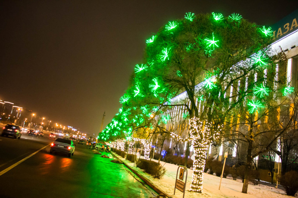Ночной город также освещают и деревья вдоль улиц. Сотни ярких гирлянд сегодня радуют не только жителей Алматы, но и гостей мегаполиса.