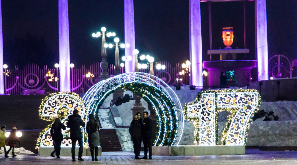Одним из самых излюбленных и живописных мест для жителей и гостей города стал украшенный в новогоднем стиле парк Первого Президента. Здесь установлена мерцающая инсталляция с символичной цифрой - 2017, около которой расположилась зеленая красавица, украшенная шарами, светящимися цветами и разноцветной мишурой.