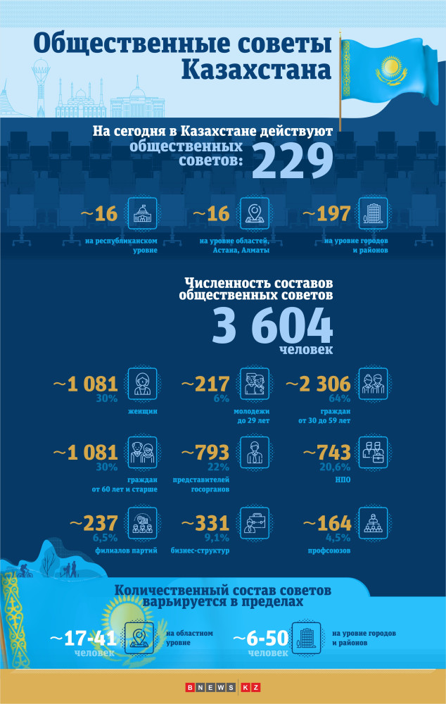 Напомним, со стороны общественных советов реализуются следующие формы контроля: используется механизм заслушивания отчётов акимов областей, городов и районов, руководителей местных исполнительных органов на заседаниях РОС при обсуждении проектов и выполнения бюджетных программ, программ развития территорий, отчётов о достижении целевых индикаторов; одним из действенных механизмов является рассмотрение всех проектов нормативных правовых актов, касающихся прав, свобод и обязанностей граждан. За 2 года советами рассмотрено более 9 тысяч проектов НПА.