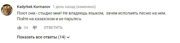 "Поют они - стыдно мне! Не владеешь языком, зачем исполнять песню на нём. Пойте на казахском и не парьтесь", - выразил свое мнение пользователь Кадырбек Курманов.