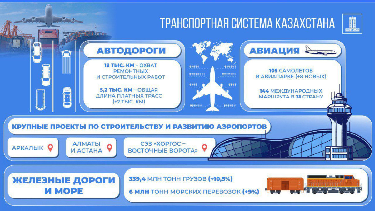 Ключевые события 2025 года: запуск второй линии ж/д Достык – Мойынты, начало строительства линии Кызылжар – Мойынты, поставка 775 локомотивов и 2,7 тыс. платформ, модернизация 124 вокзалов, новый сухогруз на линии Курык – Баку и подготовка к вводу двух паромов.