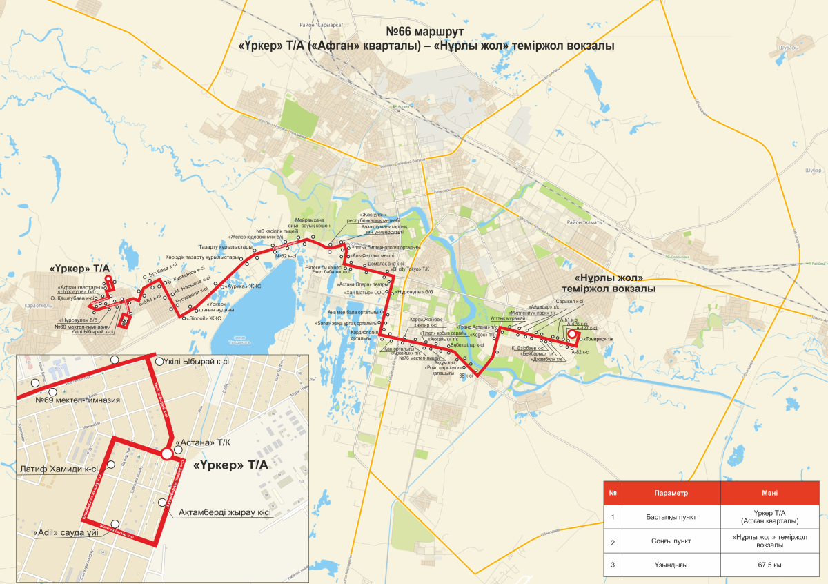 Новый автобусный маршрут №66 сообщением "Жилой массив "Үркер" - "Железнодорожный вокзал "Нұрлы жол" запустят с 4 ноября в Астане. Это стало возможным после поставки новых автобусов, передаёт BaigeNews.kz.