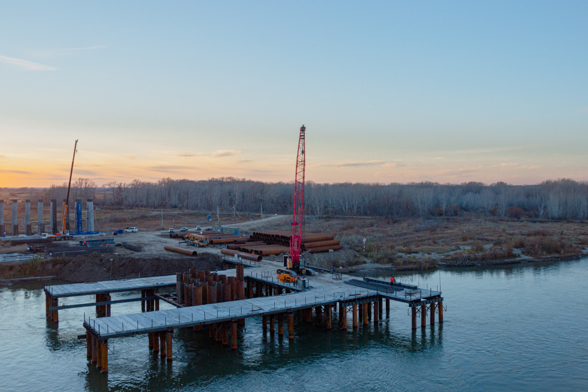 Сейчас на строительстве нового моста задействовано 196 человек и 58 единиц техники, включая погрузчики и буровые машины. На текущий момент завершены работы по устройству первой и шестой береговых опор. А вот низкие платформы, которые возвели у берега, это не сам мост через Иртыш. Это просто технологические мосты. Они временные и необходимы, чтобы тяжёлая техника могла подъехать к нужной точке. Тем более, часть опор будущего моста будет находиться в воде. К слову, сейчас на объекте нет иностранцев, но возможно их будут привлекать при установке вантовых систем.