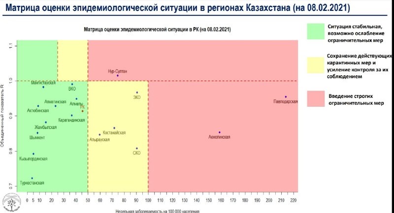 Опубликована матрица оценки эпидемиологической ситуации в регионах Казахстана на 8 февраля, передает BaigeNews.kz.