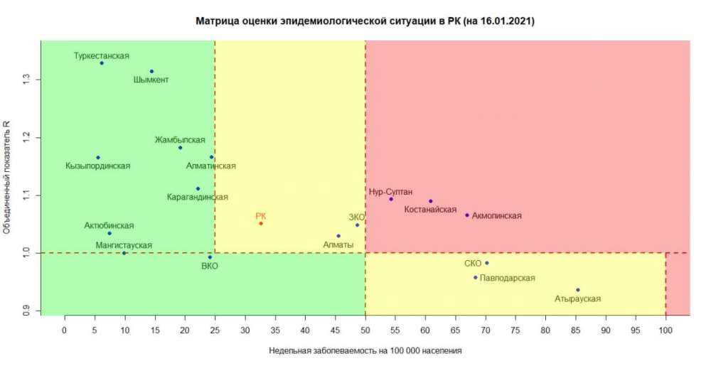 Опубликована матрица оценки эпидемиологической ситуации в регионах Казахстана на 16 января 2021 года, передает BaigeNews.kz со ссылкой на coronavirus2020.kz.
