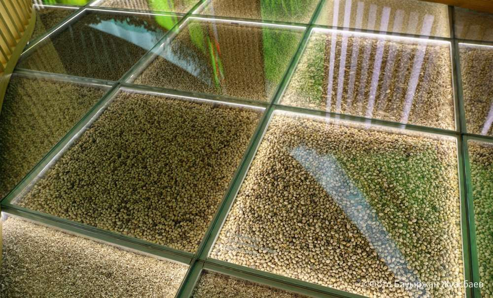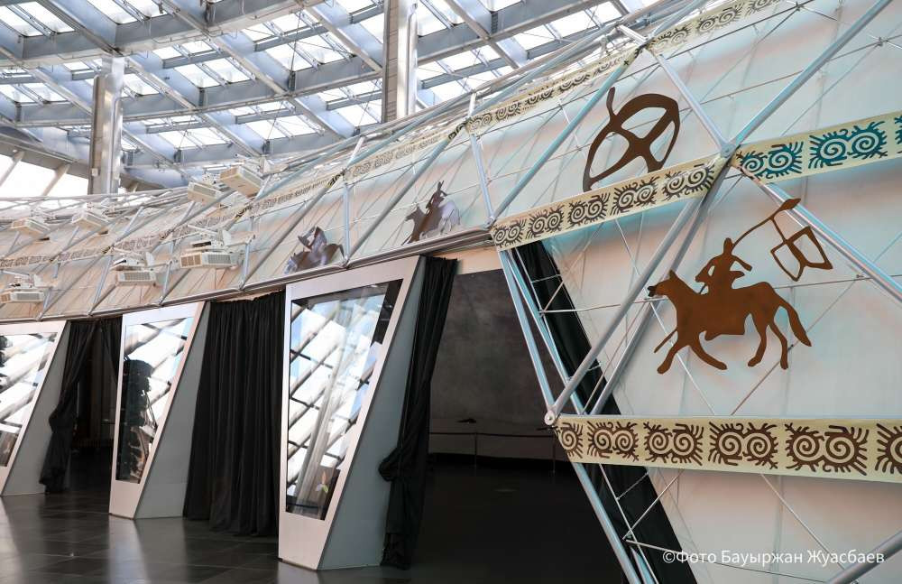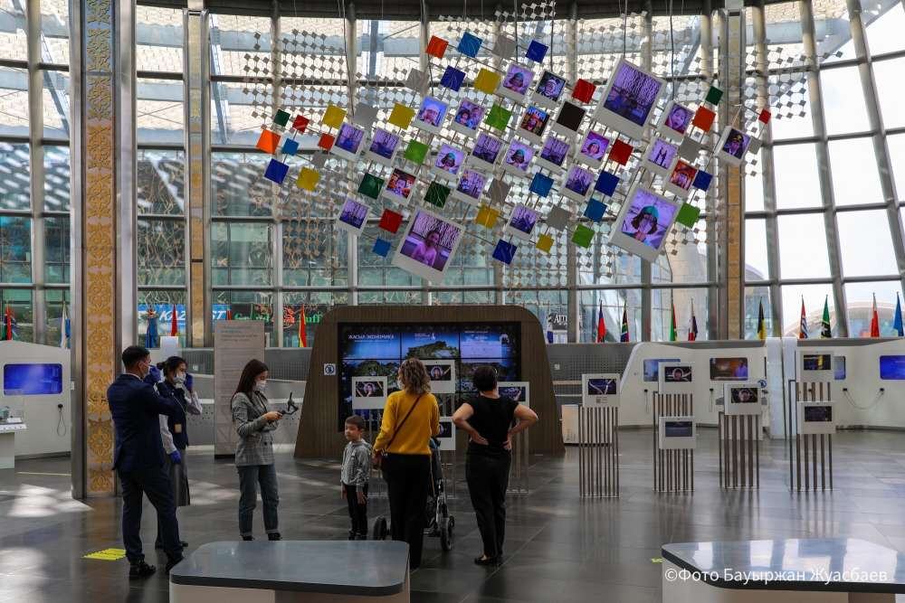 Завершает экскурсию инсталляция "Вместе под одним небом". Каждый посетитель может сделать свою фотографию, которые образуют карту Казахстана.