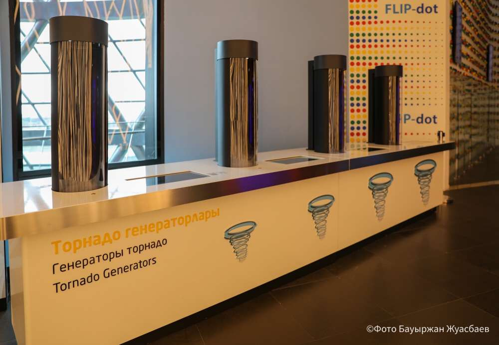 После чего можно посетить инсталляцию "Генераторы торнадо". Они предоставят детальную информацию уже об штормовом ветре. Также с помощью сенсорных панелей можно создать небольшое торнадо внутри генераторов.