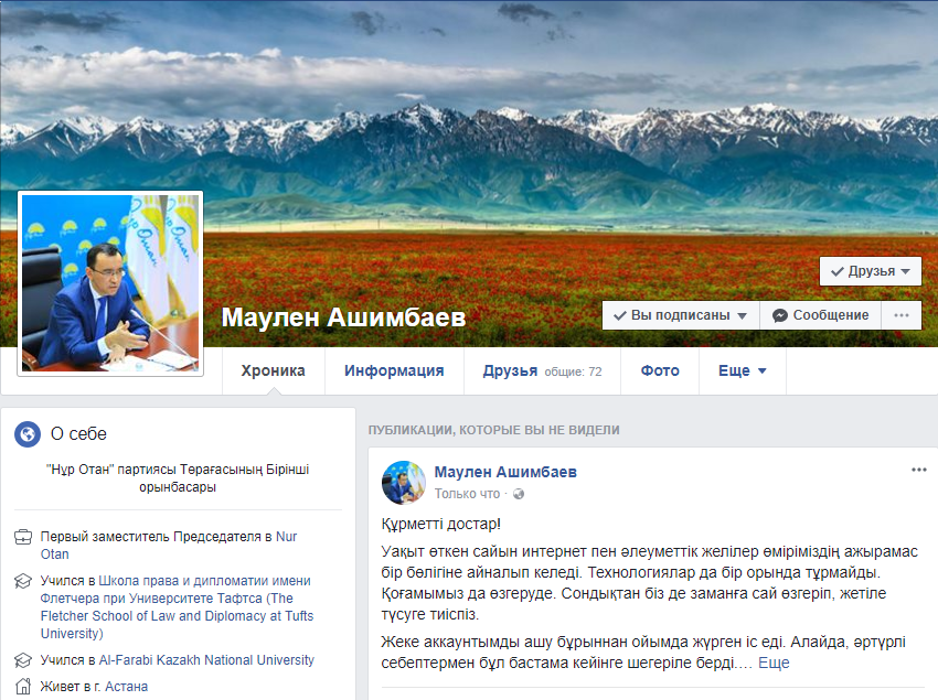"В партии "Нур Отан" идут масштабные процессы модернизации, мое появление в Facebook считаю вполне естественным и своевременным. Именно на этой площадке часто звучат очень интересные идеи, которые могут быть полезны, в том числе и для нашей политической организации", - написал Маулен Ашимбаев.