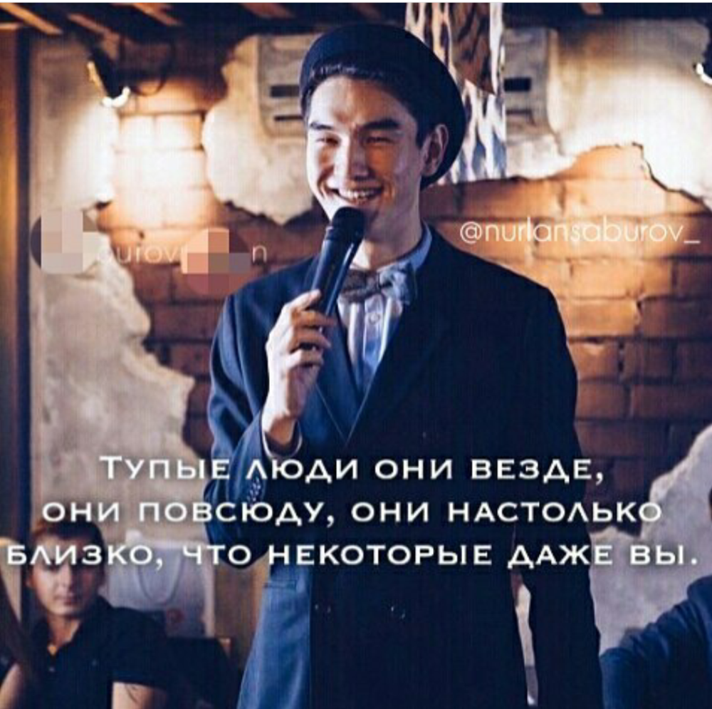 "Тупые люди, они везде. они повсюду. Они настолько близко, что некоторые даже вы". Земляки характеризуют популярного стэндапера как воспитанного и интеллигентного, очень сдержанного человека. Он знает и чтит казахские традиции, многое в его характере от благородного и умного дедушки. Степногорцы говорят, что реальный образ Нурлана Сабурова не совпадает со сценическим. Тем не менее его юмор, - резковатый, порой саркастический и гиперболизированный - называют жизненным и нужным. Иногда полезно посмотреть на себя со стороны и посмеяться.