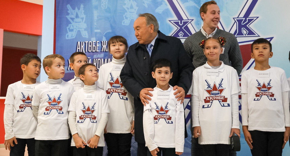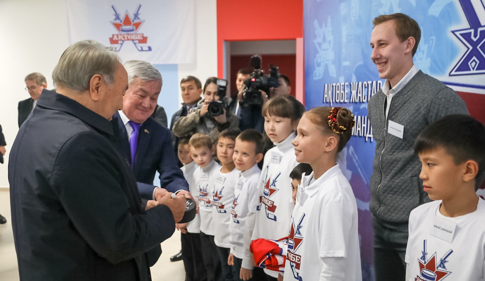 Нурсултан Назарбаев поздравил молодых хоккеистов, а в их лице всех актюбинцев с открытием Ледового дворца и сделал памятную надпись на символической шайбе.