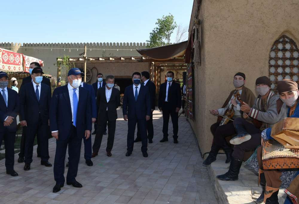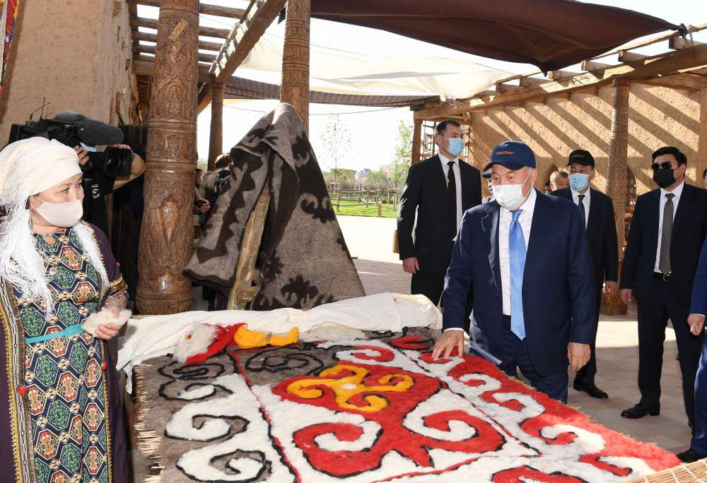 В ходе посещения Нурсултан Назарбаев осмотрел улицу ремесленников, состоящую из пяти тематических мастерских: деревообработка, ткачество и войлоковаляние, гончарное ремесло, ювелирная мастерская, каменотес, а также посетил гастрозону этно-аула.