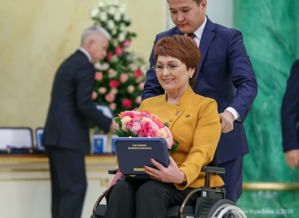 Фото: Бауыржан ЖуасбаевЗнак отличия высшей степени "Қазақстан Еңбек Ері" (Герой труда Казахстана) присвоены: председателю общественного объединения "Центр поддержки парализованных граждан" города Актобе Куралай Байменове, руководителю крестьянского хозяйства "Шәушен" из района Турара Рыскулова Жамбылской области Сайрамбай Даненбаеву, учителю КГУ "Школы гимназии №1 им. А.С.Пушкина" города Шымкент Алина Соловьева.
