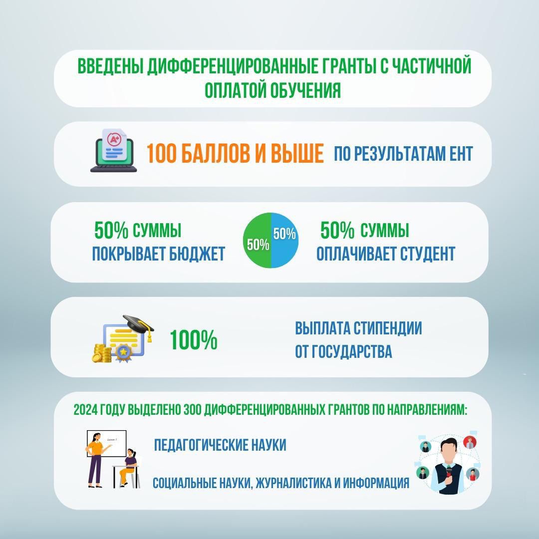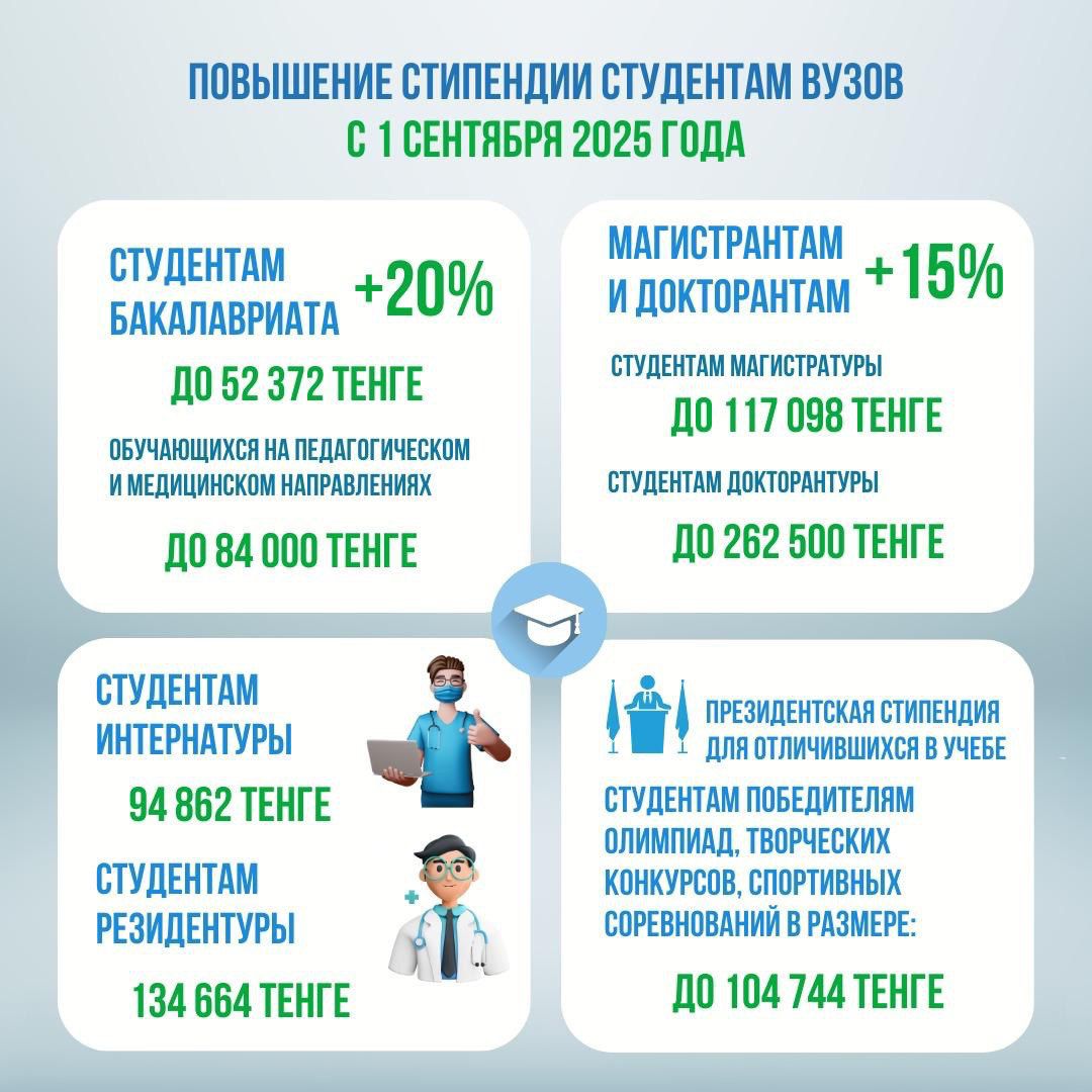 - Государство продолжает планомерную работу по увеличению стипендий для студентов вузов, чтобы улучшить условия для обучения и поддержать студентов. В 2025 году для студентов вузов и колледжей стипендия повысится в 2 раза, а для магистрантов и докторантов — в 1,75 раза. С 1 сентября 2025 года студенты бакалавриата будут получать стипендию в размере 52 372 тенге, а для обучающихся на педагогических и медицинских направлениях — до 84 000 тенге. Магистранты получат 117 098 тенге, а докторанты — 262 500 тенге. Для студентов, обучающихся в интернатуре, стипендия составит 94 862 тенге, а в резидентуре — 134 664 тенге. Также предусмотрены повышенные стипендии для студентов, сдающих экзамены на "отлично".
