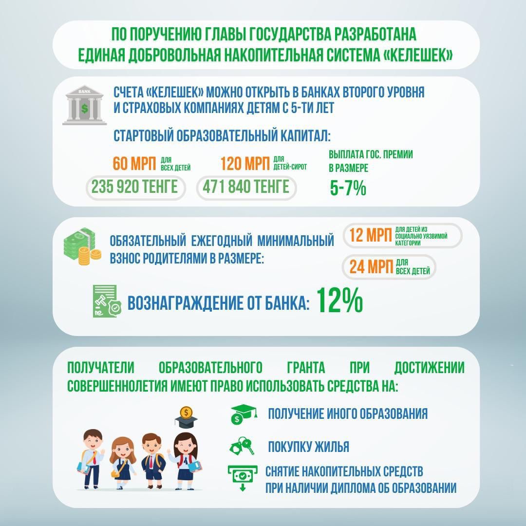 - В рамках исполнения поручения Главы государства, озвученном в Послании народу Казахстана 1 сентября 2023 года, разработан Закон по внедрению единой добровольной накопительной системы "Келешек", которая станет дополнительным механизмом обеспечения доступа граждан к высшему образованию и объединит в себе существующие меры поддержки. Данная мера государственной поддержки предназначена детям Казахстана в возрасте от 5 лет для стабильного накопления финансовых средств до достижения ими 18 лет для оплаты образовательных услуг в стране и за рубежом, включая высшее, а также техническое и профессиональное образование.