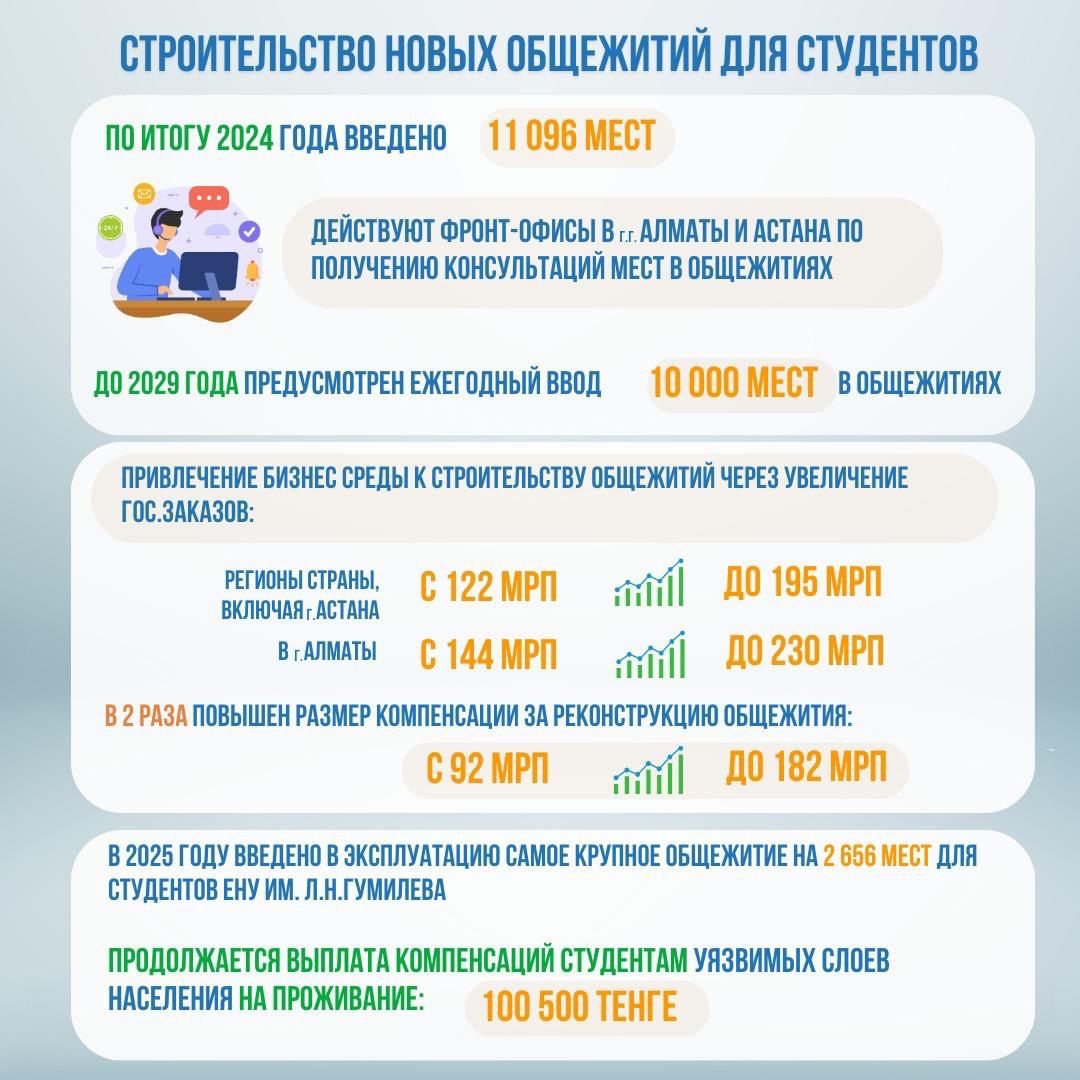 - Для улучшения инфраструктуры для студентов в Казахстане предпринимаются значительные шаги, направленные на строительство новых общежитий. До 2029 года планируется ежегодное введение 10 тысяч мест в общежитиях, и уже в 2024 году было введено 11 096 мест. В крупных городах, таких как Астана и Алматы, действуют проектные фронт-офисы, которые помогают студентам своевременно получить места в общежитиях.