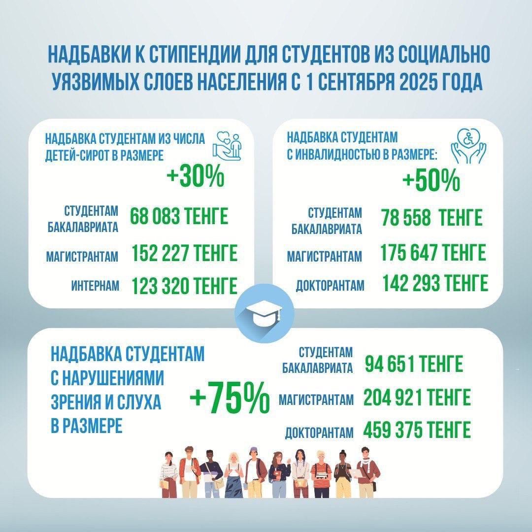 Для определенных категорий студентов установлены дополнительные надбавки. Студентам с нарушениями зрения и слуха, которые получают высшее или профессиональное, послесреднее, послевузовское образование, установлены надбавка студентам бакалавриата – 94651 тенге, магистрантам – 204921 тенге, докторантам – 459 375 тенге. Лица с инвалидностью или увечьями вследствие ранений, заболеваний или контузий также имеют право на надбавки: студентам бакалавриата – 78 558 тенге, магистрантам – 175 647 тенге, интернам – 142 293 тенге. Студенты из числа детей-сирот, оставшихся без попечения родителей или находящихся под опекой (попечительством) получают надбавки на уровне 30% от базовой стипендии, что составляет 68 083 тенге для бакалавров, 152 227 тенге для магистрантов и 123 320 тенге для интернов.