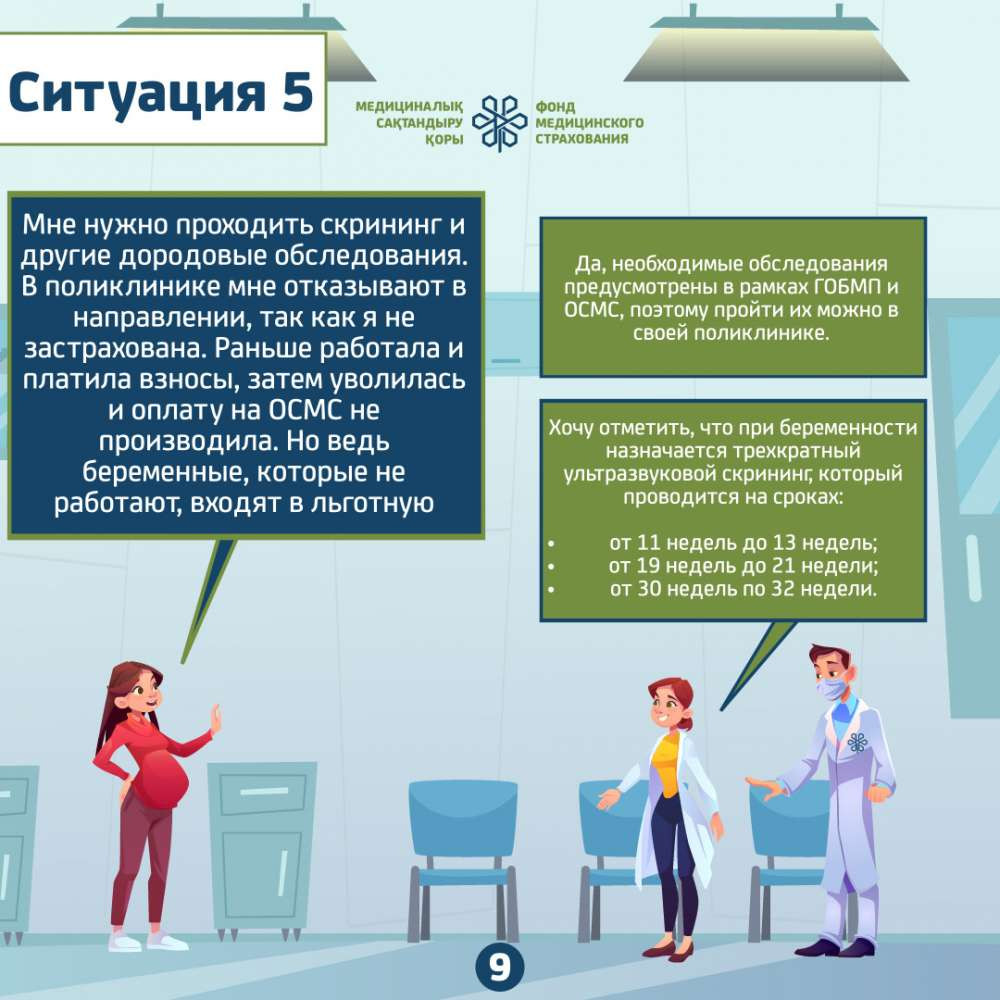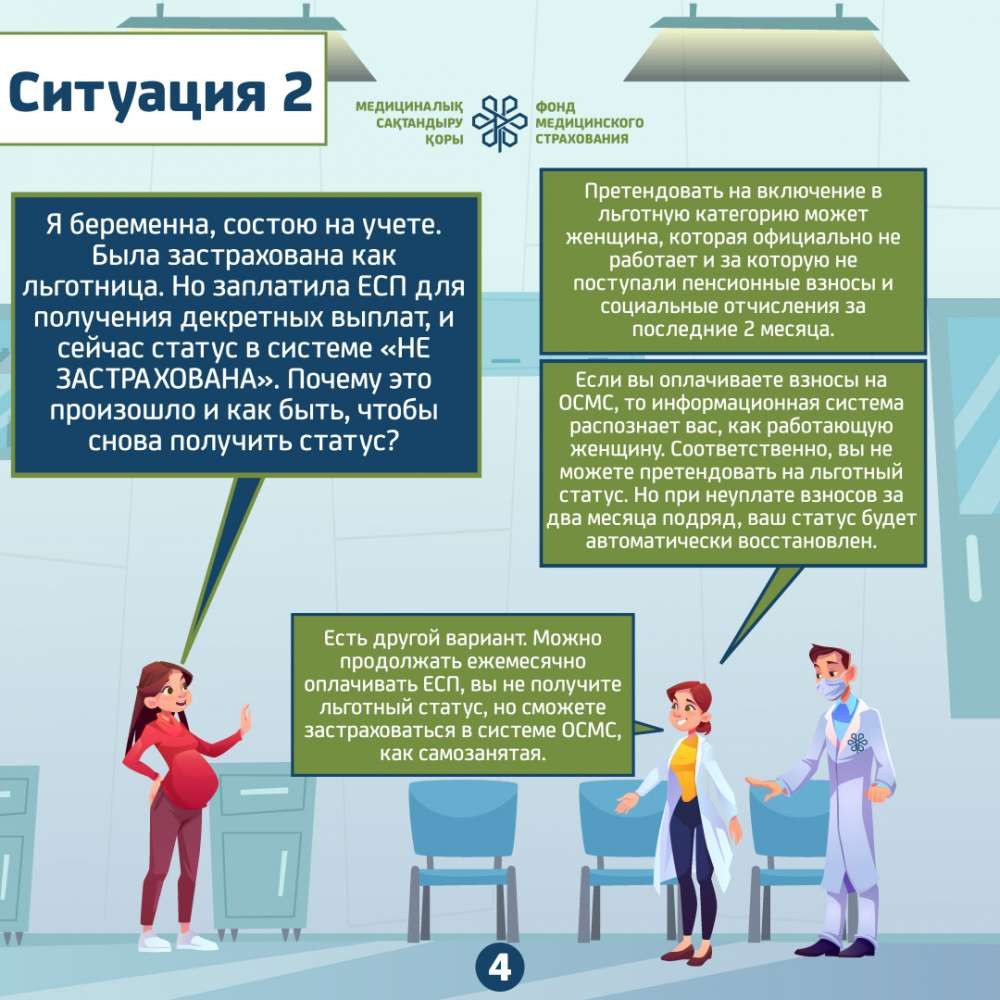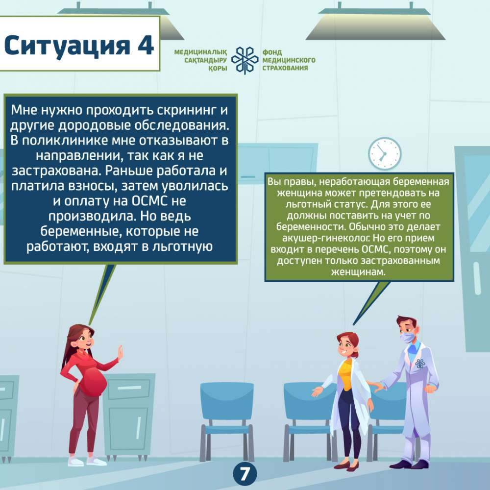 Ситуация 4: "Мне нужно проходить скрининг и другие дородовые обследования. Но в поликлинике мне отказывают в направлении, так как я не застрахована. Раньше работала и платила взносы, но затем уволилась и оплату на ОСМС не производила. Но ведь беременные, которые не работают, входят в льготную категорию. Почему меня лишают права пользоваться ОСМС?"