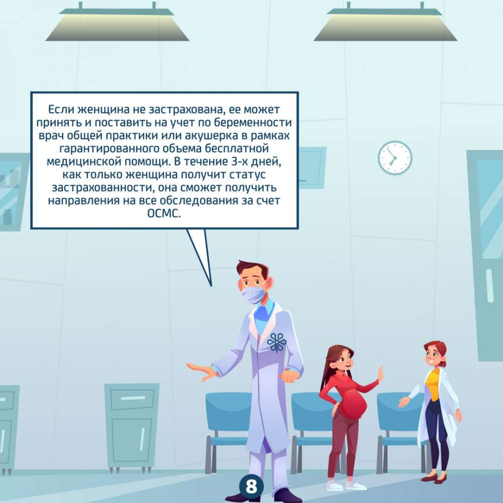 "Однако, если женщина не застрахована, её может принять врач общей практики или акушерка и поставить на учёт по беременности. Приём этого врача входит в ГОБМП. В течение трёх дней женщина получит статус застрахованной в качестве льготной категории. После этого она сможет получить направления на все обследования, которые входят в перечень ОСМС", – объяснила эксперт.