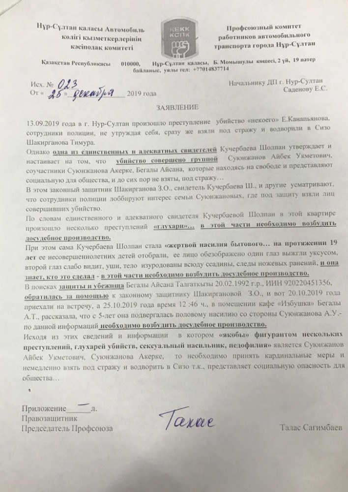 В качестве доказательства правозащитник предоставил заявление, отправленное начальнику ДП города Нур-Султан.