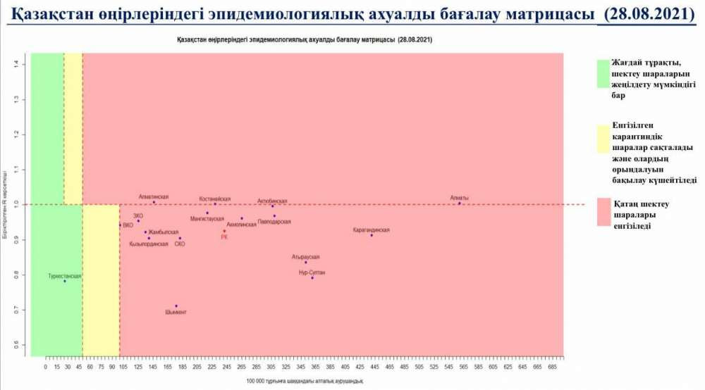 Опубликована матрица оценки эпидемиологической ситуации в регионах Казахстана на 28 августа 2021 года, передает BaigeNews.kz со ссылкой на coronavirus2020.kz.
