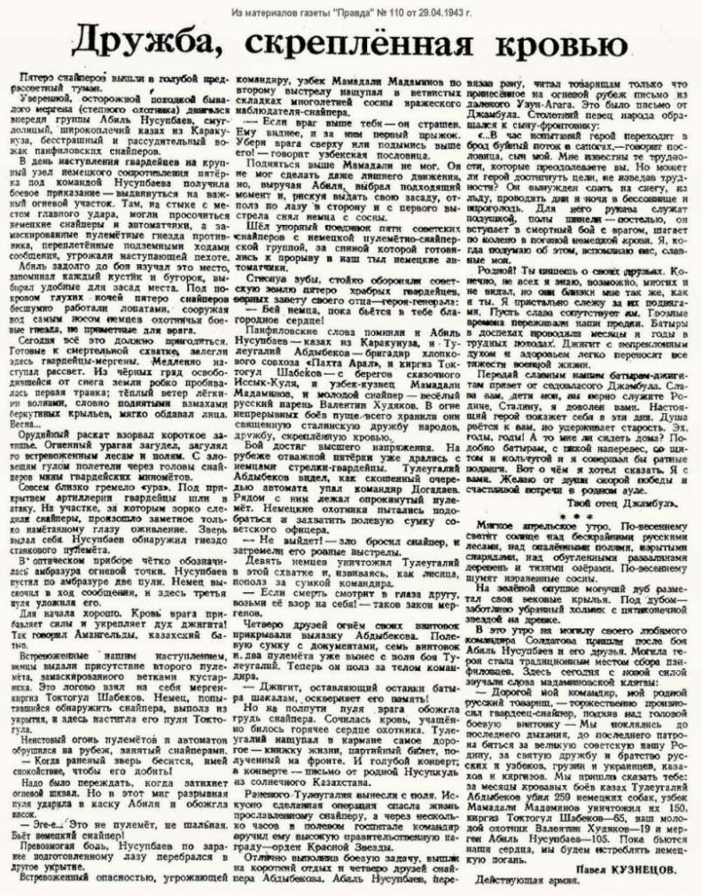 На армейском слёте снайперов летом 1943 года под Великими Луками выступил прославленный снайпер Сулейменов. Он сказал: "Почему я стал снайпером? Я начал войну под Москвой. Я видел расстрелянных колхозников, колхозниц и их детей. Я входил в дома, и мне говорили люди, как издевались над ними гитлеровцы. Я видел в каждом доме горе, страдание. Я и сейчас не могу спокойно чувствовать себя. Мне стало тяжело это видеть. Я поклялся в те дни стать снайпером. Почему я защищал Москву? Я казах, мой Казахстан далеко от Москвы. Но Москва — столица всего нашего Союза. Она и моя столица. Вот почему я защищал Москву. Но это не всё. Я подумал: если фашистов не остановить и не уничтожить, они могут дойти и до моего родного Казахстана. Я не успокоюсь до тех пор, пока хоть один гитлеровец будет топтать нашу землю. Я уничтожил 239 фашистов. Призываю и вас нести смерть оккупантам".