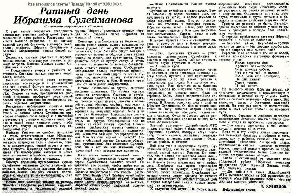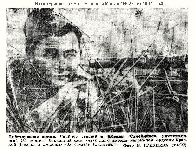 Казаха Ибраима Сулейменова немецкие солдаты прозвали "Степным стрелком". Он был одним из лучших снайперов Великой Отечественной войны. За мужество и отвагу дважды был представлен к званию Героя Советского Союза.