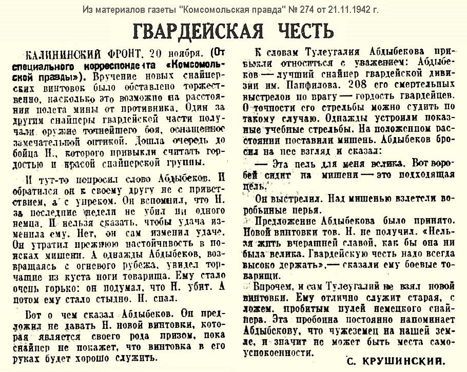 Так и появился в рядах Красной армии снайпер 2-й роты 1-го стрелкового батальона 1077-го (позже 30-го) стрелкового полка 8-й гвардейской стрелковой дивизии 22-й армии генерал-майора Панфилова, старший сержант Толеугали Абдибеков, член ВКП(б).