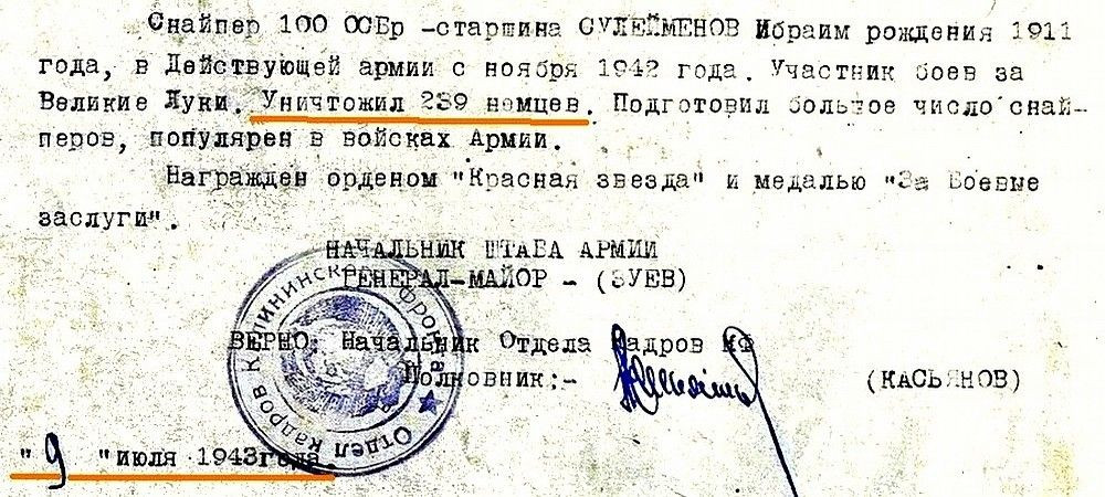 К 9 июлю 1943-го на счету Сулейменова было уже 239 немцев.