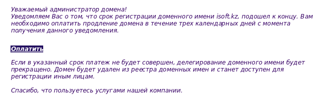 В адрес Службы KZ-CERT участились обращения от владельцев доменных имен казахстанского сегмента Интернет о фишинговой рассылке от имени хостинговых компаний РК следующего характера.