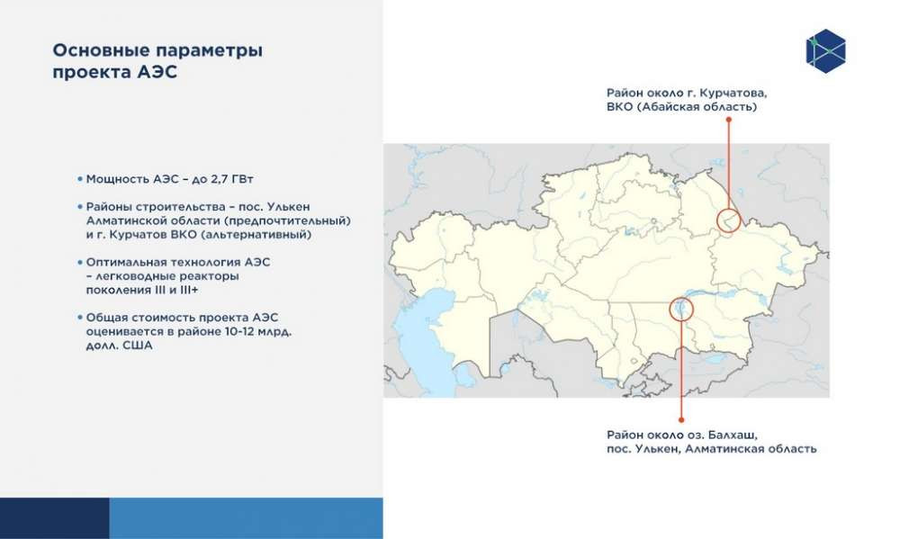 В 2013 году были созданы межведомственная комиссия и рабочая группа, которые после изучения нескольких потенциальных мест размещения АЭС рекомендовали два района: город Курчатов рядом с рекой Иртыш (ВКО) и поселок Улькен вблизи озера Балхаш. В обоих районах с привлечением профильных специалистов проведены предварительные исследования, изучены исторические и научные документы, которые подтвердили пригодность обеих площадок для строительства АЭС.