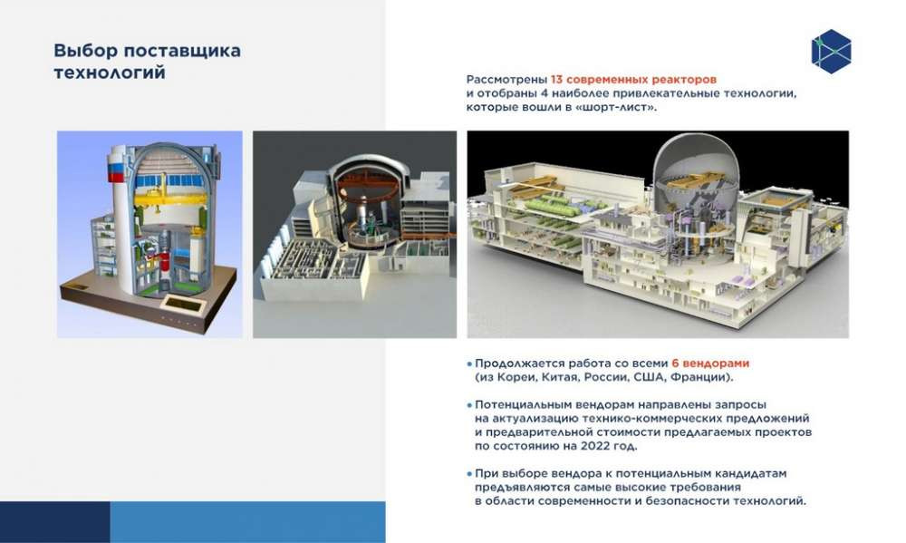 В 2019 году были запрошены технико-коммерческие предложения от ключевых мировых владельцев атомных технологий. В результате были получены предложения от шести известных компаний из пяти стран — Кореи, Китая, Россия, США и Франции, которые предоставили на рассмотрение 13 различных вариантов реакторов с разной мощностью, компоновкой и так далее.