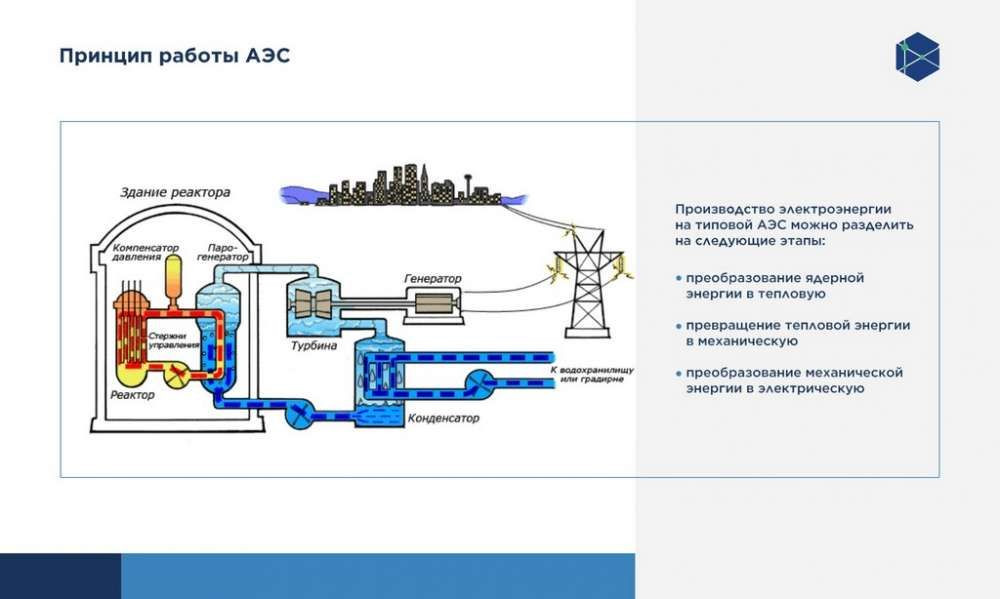 В чем принцип работы атомной электростанции: она кардинально отличается от ТЭЦ только в том, что является источником той тепловой энергии, которую потом преобразуют в электрическую. На ТЭЦ это уголь, мазут или газ, который "закидывают" в большую печку, в АЭС — ядерная энергия, которая вырабатывается через три стадии: в реактор загружаются тепловыделяющие сборки, состоящие из множества маленьких трубок, называемых твэлами, внутри которых находятся топливные таблетки, где и происходит то самое ядерное деление урана-235.