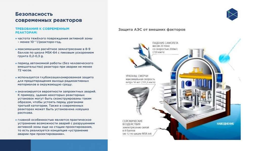 Отдельно можно отметить низкую себестоимость электрогенерации, то есть самого производства электроэнергии, но как это повлияет на конечный тариф для потребителей, будет просчитываться дополнительно при разработке проектной документации, в том числе технико-экономического обоснования. И обеспечение надежного электроснабжения, потому что современные реакторы спроектированы таким образом, что они могут безопасно эксплуатироваться в течение 60 лет. Сейчас даже для старого поколения реакторов, к примеру, в США продлевают период эксплуатации, а потенциально этот срок можно растянуть и до 100 лет.