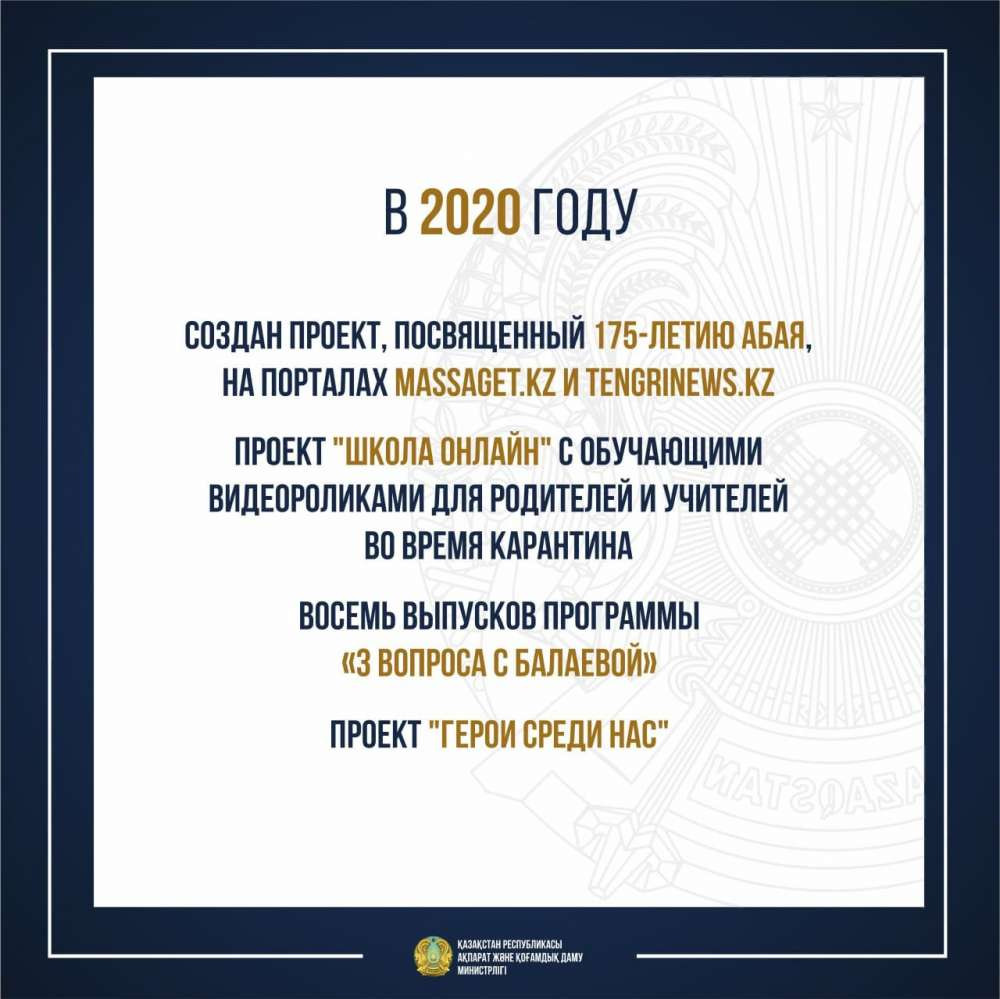 "Кроме того, создан проект, посвященный 175-летию Абая, на порталах Massaget.kz и Tengrinews.kz, проект "Школа онлайн" с обучающими видеороликами для родителей и учителей во время карантина, вышло восемь выпусков программы "Три вопроса Балаевой", а также проект "Герои среди нас". В сфере гражданского общества реализуется масштабный проект "Академия НПО", прошел в онлайн-формате IX Гражданский форум Казахстана, проведена экспертиза 2700 материалов, не допущено к обороту 1295 материалов деструктивного характера, отведены от деструктивных сайтов и социальных сообществ более 70 тысяч человек", - говорится в опубликованных итогах 2020 года от МИОР.