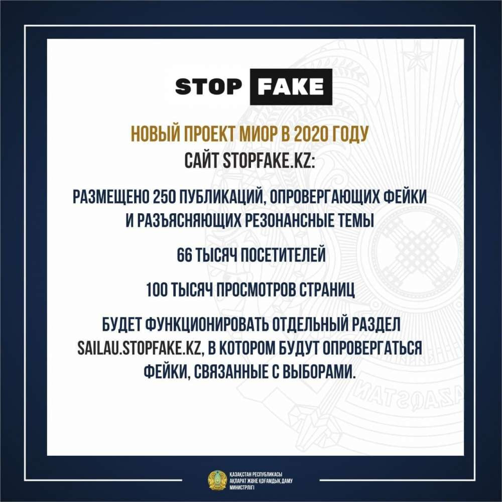 В 2020 году МИОР запустил несколько новых проектов, и один из них - сайт Stopfake.kz, где были опубликованы 250 публикаций, опровергающих фейки и разъясняющих резонансные темы. За время существования портала его посетили 66 тысяч пользователей, страницы сайта просматривали 100 тысяч раз. Скоро на Stopfake.kz заработает новый раздел sailau.stopfake.kz, где будут опровергаться фейки, связанные с выборами.