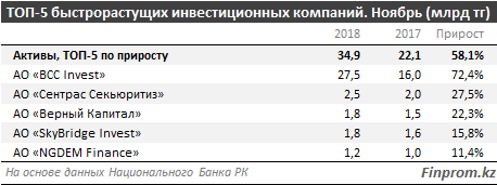 В Казахстане к декабрю совокупный объём активов инвестиционных компаний достиг 180,2 млрд тенге, прирост произошел 2,6% год-к-году. В 2017 году сумма активов составляла 175,7 млрд тенге, при годовом росте на 47,3%. За последние три года объём активов увеличился на 50,1%, говорится в исследовании Finprom.kz.