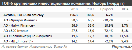 В топ-5 вошли "Казкоммерц Секьюритиз" (19,6 млрд тенге) и ИД Fincraft (14,1 млрд тенге).