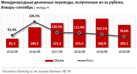 Объем средств, полученных казахстанцами из-за рубежа с помощью систем денежных переводов (СДП), за январь–сентябрь 2020 года составил 205,1 миллиарда тенге – сразу на 21,4 процента меньше, чем за аналогичный период прошлого года.