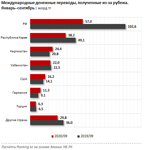 Более двух третей объема средств приходит в Казахстан всего из четырех стран. Лидирует Россия: оттуда перевели 57 миллиарда тенге, при этом это почти в 2 раза меньше прошлогоднего показателя.