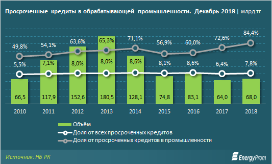 В то же время качество портфеля в секторе заметно ухудшилось. Объём просроченных кредитов в обрабатывающей промышленности вырос на 6,2%, до 68 млрд тенге, в то время как просрочка в целом по кредитам экономике сократилась на 12,5%, а непосредственно по займам в промышленность — на 8,6%.