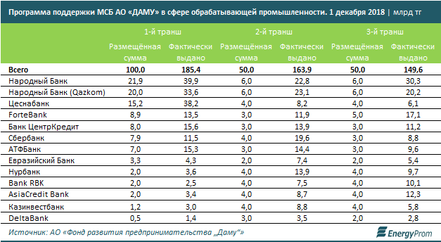 С момента запуска программы в 2014 году фонд "Даму" выделил банкам 3 транша в размере 200 млрд тенге. В свою очередь, банками-партнёрами на 1 декабря 2018 года было фактически выдано (в том числе за счёт револьверных выдач) 498,9 млрд тенге.