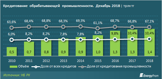 Объём кредитования обрабатывающей промышленности за год увеличился на 2,7% и составил на конец 2018 года 1,4 трлн тенге. При этом объём кредитования промышленности в целом вырос на 2%.