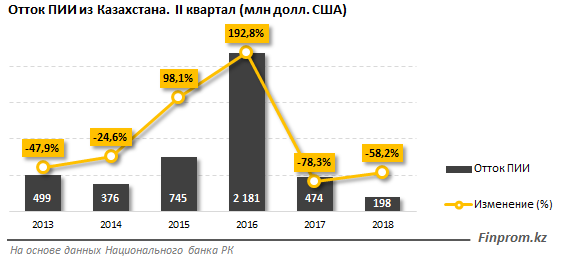 В I полугодии 2018-го зафиксирован самый низкий объём оттока инвестиций за рубеж — всего 532,5 млн долларов, из которых на II квартал пришлось 198 млн. Для сравнения, за аналогичный период 2017 года валовый отток прямых инвестиций от казахстанских инвесторов — 1,4 млрд долларов, а в 2016-м — 2,8 млрд.