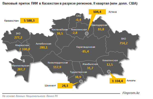 Традиционно наибольшая концентрация — у Атырауской области: 40,8% от РК (пять млрд долларов за I полугодие текущего года, из них 2,3 млн — за II квартал).