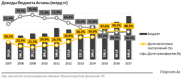 Астана наращивает экономическую эффективность. За последние 10 лет 2017 год стал рекордным по доходности бюджета Астаны - 469,4 млрд тг против 405,9 млрд тг в 2016, передаёт BNews.kz со ссылкой на finprom.kz.