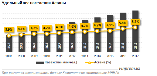 По итогам первого квартала 2018 года население столицы составляет 1,04 млн чел (годом ранее - 993,7 тыс чел). Однако по мере реализации плана Астанинской агломерации численность населения столицы к 2020 году увеличится до 1,07 млн чел, а во всей агломерации - до 1,34 млн чел.