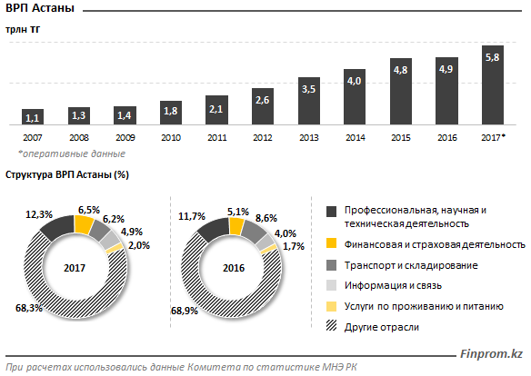Валовый региональный продукт Астаны по итогам 2017 года составил 5,8 трлн тг, что на 18,5% больше, чем годом ранее - 4,9 трлн тг.