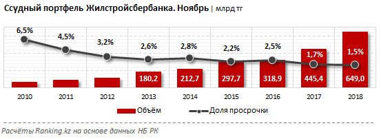 Один из ключевых факторов, обеспечивающих высокое качество портфеля ипотечного кредитования в Казахстане — работа Жилстройсбербанка. Вес просрочки в ссудном портфеле ЖССБ составляет всего 1,5% (годом ранее — 1,7%). При этом объём кредитов за последний год вырос сразу на 45,7%, до 649 млрд тенге.