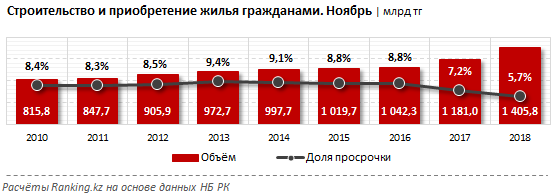 Объём кредитов на строительство и приобретение жилья казахстанцами продолжил уверенный рост и на конец ноября 2018 года достиг 1,4 трлн тенге, что на 19% больше, чем в 2017 году, сообщает Ranking.kz.