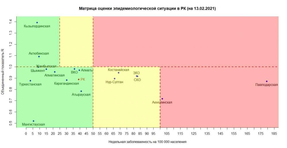 Опубликована матрица оценки эпидемиологической ситуации в регионах Казахстана на 13 февраля 2021 года, передает BaigeNews.kz со ссылкой на coronavirus2020.kz.